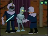 2 After Bender talks about his backup unit and says "I never said I wasn't a drama queen", Fry is poked by one of the Sith re-enactors, and pretends to die. Bender lights a cigar, laughs, and says "I'm so much better than humans, it's sick!" Addition