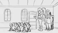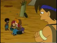3 Original and alternate ending for the episode. Instead of adopting the orphans, Abner Doubledeal opens an amusement park on Rumbledy-Hump, and takes a majority share of income due to the Humplings having a terrible lawyer. A mortified Leela complains about the park, but the Humplings announce their joy at being famous. Warden Vogel thanks Leela for providing the orphans with a field trip. Leela begs for everyone to blame her, but is given a bat by the orphans, which she uses to beat up the lawyer. Replacement