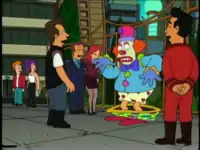"Parasites Lost" 1 During their walk, Leela and Fry see a clown who loses his trousers, Fry laughs harder than Leela and Leela says he is good, but not that good. Then Fry explains to Leela that it is so funny because the clown obviously has a career, that a business man nearby is laughing only to support him, despite the fact that his wife is more interested in the clown himself, though according to Fry, the clown is obviously gay. Which is why it is so funny. Addition