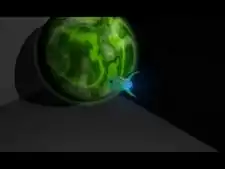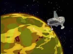 Description: Vergon 6 was a sunny little planet home to many species of non-sentient animals and for the past 1000 years, Nibbler. The planet was once full of dark matter, but it was all mined out by the DOOP, leaving Vergon 6 completely hollow. It is almost completely covered in plains with the occasional pond or rocky outcrop or other landform. Vergon 6 imploded because there was nothing to hold up the surface, but as Leela pointed out, some of the animals survived on the tiny bit of Vergon VI's core. The planet's sky was green-yellow with light green clouds. It had at least three moons.