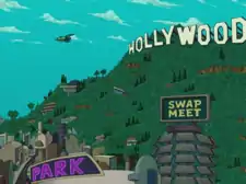 Los Angeles is a wasteland with gangs and tanks fighting constantly. The outskirts are filled with green fog and is mostly deserted. The only places that aren't in ruins are the district of Hollywood, still thriving with business and still the center of the movie business, as well as Beverly Hills and the Westside, home of the La Brea Tar Pits.