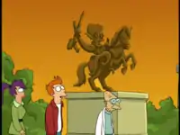 Statue![]() Screenie Description: There is a statue of an unspecified, ray-gun weilding alien atop a horse near Mars University's front gate. This statue reappears in "Where the Buggalo Roam". | |