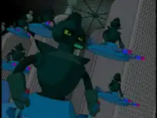 - The endless rows are similar to the Mines of Moria in the Lord of the Rings, although the first of the LOTR films was released after this episode. Though they could be inspired by the original works of Tolkien or other animated adaptations, they are more likely an intentional evocation of The Matrix in that these endless rows are filled with towers, the towers filled with the elderly. The parallelism is confirmed when Professor Farnsworth is discovered in a capsule similar to Neo's. This is confirmed in Near-Death Wish when Leela states that the elderly are used to power the Near-Death Star and adds that the idea came from the movie itself.