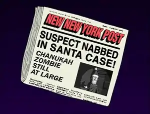 - "Suspect nabbed in Santa case / Chanukah Zombie still at large" - Robot Santa Claus being taken in by the police.