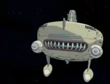 This intergalactic flagship looks like a cross between the mouth of a shark and a can of ham, and has fourteen decks. [4ACV05] It was severely damaged by the Decapodians when Earth and Decapod 10 were at war, but was later repaired and rescued the Planet Express crew from an energy being, by arresting them. [4ACV11] During 3007, the Nimbus was struck and fell towards Earth, though it was again repaired, and played an important role in the Battle for Earth. In 3008, the Nimbus also defended Earth from Yivo. It was later sliced in two again in Leo Wong's miniature golf course, and repaired at an XM Radio repair station just in time to arrest the Feministas, who had conveniently come out of a nearby wormhole. The ship was later destroyed after crashing in New New York, with the Planet Express ship, in 3009. However, it was used during the battle against the Neanderthals, in 3012. [7ACV08] This Nimbus could just be a new one that was built after the old one was destroyed.
