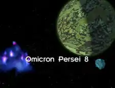 Omicron Persei 8 is a planet situated about 1000 lightyears from Earth, in orbit around the star of Omicron Persei. The rulers of the planet are Lrrr and his wife Ndnd. Its surface seems to consist mainly of deserts. It is the home world and capital of the warlike Omicronians, the single greatest threat Earth and the entire Democratic Order of Planets are facing. It seems to have a small, asteroid-like satellite. [1ACV12] In addition to this, there are hundreds of small moons in the planet's low orbit. [7ACV16]