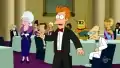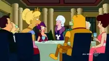 In September of 3010, the Queen of Yonkers attended the Annual Astor Endowment Fundraiser in the headquarters of the New New York Historical Society (6ACV12). She sat at the same table as Mayor Poopenmeyer, Professor Farnsworth, Fry, Leela, Ron Whitey, two brown-haired Humans (both a male and a female), and Calculon. In response to a Sewer Mutants comment by event host Mrs. Astor, the Queen revealed that her great-uncle once saw a rat. While at the fundraiser, she also assisted Leela's arrest by the NNYPD. She was later seen walking on the streets with the Mayor, on which is assumed to have been a date. It is unknown whether she and the Mayor have a relationship of their own or not, but they were seen together again shortly afterwards (6ACV14). The date was interrupted when an air conditioner, which had just lifted her dress a little too high, exuded an enormous quantity of sewage that sent the royalty girl through the air. In June of 3012, she got her crown stolen by Ben RodrÃguez while sunbathing with Sal (7ACV01).