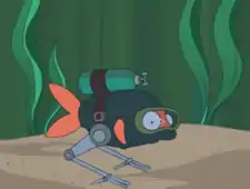 The reverse scuba suit is an invention made by Dr. Wernstrom used by his pet fish Cinnamon. It is a suit worn by fish which allows them to breathe above water by using a bottle of water and metal legs, although it is unclear as to how the fish wearing the suit controls these legs. It won Wernstrom the Prize for Academy of Inventors in 3000 (1ACV08). The Zookeeper uses similar technology for his piranhas (4ACV04).