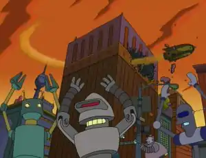 With help of "the wheel" built by Fry, they all went to Mom's cabin in the Bronx. Farnsworth managed to seduce Mom but unfortunately forgot about stealing the remote and just slept with her. Mom decided to end the rebellion before the robots ruined that "wonderful moment" with Farnsworth, but the bra is on top of a ceiling fan, which is robotic too. Just as the robots began to attacking, Bender joined the humans after learning the new robot society wouldn't include beer and got the bra with the controller from the fan. Mom ended the rebellion, but finished with Farnsworth when she discovers he just wanted the bra.
