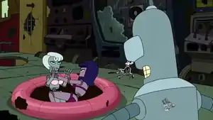 Ruth, Esther and Bender were to have an orgy, but they were disrupted by a glowing Fry. Ruth and Esther later mocked Bev, who responded by spraying them with soda water. [7ACV01]