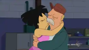 In 3010, Scruffy's wash bucket swaps bodies with Amy Wong, and confesses her feelings for him. While admitting his own love, he realizes that it's wrong, even in a human body, as they are too different - him, a man, and her, janitorial equipment. He ultimately asks her to leave before he changes his mind, and falls back crying to his bed (6ACV10).