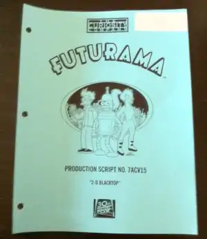 On 14 December 2011, geek blog Geekologie posted an image of the production script cover of "7ACV15" to their Facebook page, revealing the episode's title to be "2-D Blacktop".[27] The picture was accompanied by the following description: "got to see Matt Groening, Leela AND Fry (Leela has two eyes and looks like Peggy Bundy FYI). No Bender though (I think he was scared)".