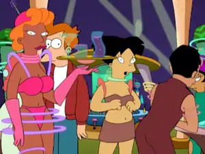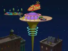 The Hip Joint is the hottest dance club in New New York. It has many customers and even special nights like a Robot Party Night (where driving robots drink for free). The place is normally crowded and is a great place to meet people or go on dates if you don't fancy a quiet night at Elzar's Fine Cuisine. The club has multiple floating dance floors and booth seating for patrons to enjoy. The decor, according to Amy, is totally retro, dancers and waitresses can be seen wearing trendy neon rings. Amy states that they are cool "because nobody wears them anymore, rings are stupid".