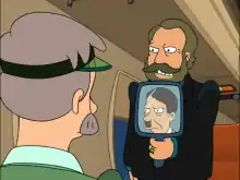 - [Man holds up a mirror, revealing that Clyde's reflection is that of Adolf Hitler.]