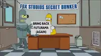 | "Simprovised" | The end of the episode featured a live-on-air Q&A with Homer, during which Bender walks across the screen holding a sign which reads "BRING BACK FUTURAMA (AGAIN)". | ![]() |