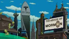 ![]() The Tesla Building in 3014. [SABF16] Disputed canon To its right appears to be Old New York's Chrysler Building. Also present are the Bart Simpson creatures. On one of the walls is written "EL BARTO". The sign reads "THE eBOOK OF MORMON" — a reference to the 2011 musical The Book of Mormon. | |
