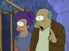 In difference to her husband, Munda seems to be the more educated type, and she has a Ph.D. in exolinguistics. She is rather quiet in comparison to her loud husband, and is very nice and unselfish, if not passive-aggressive and a bit critical. She is very friendly and dedicated to her daughter Leela up to and beyond the point she'd rather die than letting something bad happen to her, though like her husband she always fears (or even suppose and accepts) that she might be ashamed of her parents. She and her husband own a mutant cat with a tail that is a snake, and they lived in a small house in the sewers up until the Devolution Revolution of September 3010, when they were allowed up on the surface. Their current housing situation is not certain, although it is likely that, along with most of the other mutants, she chose to remain living in the sewers.