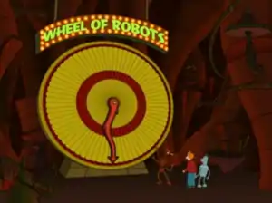 The Wheel of Robots is a big prize wheel located in Robot Hell. The Robot Devil used it to pick a robot at random to remove his hands and switch them for Fry's.