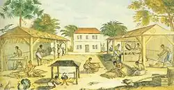 Slaves processing tobacco in 17th-century Virginia, illustration from 1670