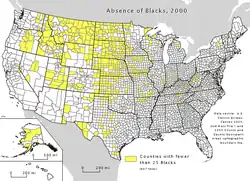 US census map indicating US counties with fewer than 25 Black or African American inhabitants