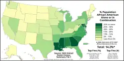 Graph showing the percentage of the African American population living in the American South, 1790–2010. Note the major declines between 1910 and 1940 and 1940–1970, and the reverse trend post-1970. Nonetheless, the absolute majority of the African American population has always lived in the American South.