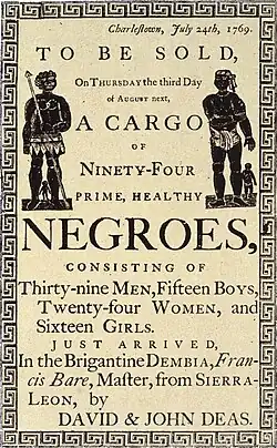 Reproduction of a handbill advertising a slave auction in Charleston, South Carolina, in 1769