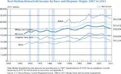 From 1965 to 1969, Black family income rose from 54 to 60 percent of White family income. In 1968, 23 percent of Black families earned under $3,000 (equivalent to $27,126 in 2024) a year, compared with 41 percent in 1960. In 1965, 19 percent of Black Americans had incomes equal to the national median, a proportion that rose to 27 percent by 1967. In 1960, the median level of education for Blacks had been 10.8 years, and by the late 1960s, the figure rose to 12.2 years, half a year behind the median for Whites.[83]