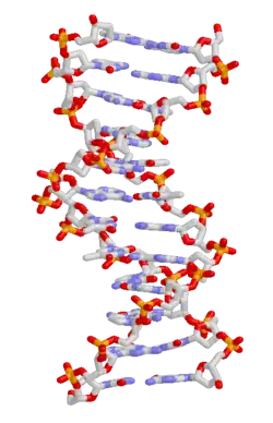 DNA structure. Bases are in the centre, surrounded by phosphate–sugar chains in a double helix.