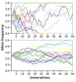 Genetic drift is the random fluctuation of allele frequencies within a population from one generation to the next.[89] When selective forces are absent or relatively weak, allele frequencies are equally likely to drift upward or downward in each successive generation because the alleles are subject to sampling error.[90] This drift halts when an allele eventually becomes fixed, either by disappearing from the population or by replacing the other alleles entirely. Genetic drift may therefore eliminate some alleles from a population due to chance alone. Even in the absence of selective forces, genetic drift can cause two separate populations that begin with the same genetic structure to drift apart into two divergent populations with different sets of alleles.[91]