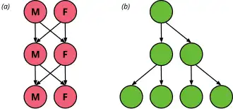 The two-fold cost of sex was first described by John Maynard Smith.[49] The first cost is that in sexually dimorphic species only one of the two sexes can bear young. This cost does not apply to hermaphroditic species, like most plants and many invertebrates. The second cost is that any individual who reproduces sexually can only pass on 50% of its genes to any individual offspring, with even less passed on as each new generation passes.[50] Yet sexual reproduction is the more common means of reproduction among eukaryotes and multicellular organisms. The Red Queen hypothesis has been used to explain the significance of sexual reproduction as a means to enable continual evolution and adaptation in response to coevolution with other species in an ever-changing environment.[50][51][52][53] Another hypothesis is that sexual reproduction is primarily an adaptation for promoting accurate recombinational repair of damage in germline DNA, and that increased diversity is a byproduct of this process that may sometimes be adaptively beneficial.[54][55]