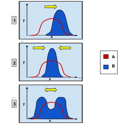 Natural selection within a population for a trait that can vary across a range of values, such as height, can be categorised into three different types. The first is directional selection, which is a shift in the average value of a trait over time—for example, organisms slowly getting taller.[80] Secondly, disruptive selection is selection for extreme trait values and often results in two different values becoming most common, with selection against the average value. This would be when either short or tall organisms had an advantage, but not those of medium height. Finally, in stabilising selection there is selection against extreme trait values on both ends, which causes a decrease in variance around the average value and less diversity.[71][81] This would, for example, cause organisms to eventually have a similar height.