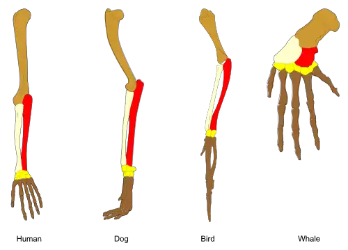Homologous bones in the limbs of tetrapods. The bones of these animals have the same basic structure, but have been adapted for specific uses.