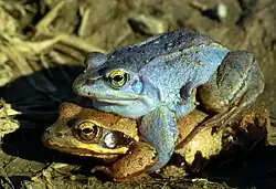 Male moor frogs become blue during the height of mating season. Blue reflectance may be a form of intersexual communication. It is hypothesised that males with brighter blue coloration may signal greater sexual and genetic fitness.[129]