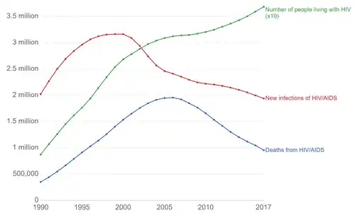 - ^ De Cock KM, Jaffe HW, Curran JW (June 2012). "The evolving epidemiology of HIV/AIDS". AIDS. 26 (10): 1205–13. doi:10.1097/QAD.0b013e328354622a. PMID 22706007. S2CID 30648421.