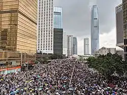 Political debates after the handover have centred around the region's democratic development and the Chinese central government's adherence to the "one country, two systems" principle. After reversal of the last colonial era Legislative Council democratic reforms following the handover,[76] the regional government unsuccessfully attempted to enact national security legislation pursuant to Article 23 of the Basic Law.[77] The central government decision to implement nominee pre-screening before allowing chief executive elections triggered a series of protests in 2014 which became known as the Umbrella Revolution.[78] Discrepancies in the electoral registry and disqualification of elected legislators after the 2016 Legislative Council elections[79][80][81] and enforcement of national law in the West Kowloon high-speed railway station raised further concerns about the region's autonomy.[82] In June 2019, mass protests erupted in response to a proposed extradition amendment bill permitting the extradition of fugitives to mainland China. The protests are the largest in Hong Kong's history,[83] with organisers claiming to have attracted more than three million Hong Kong residents.