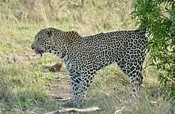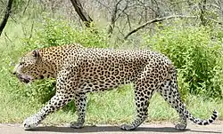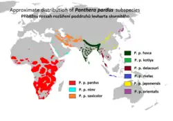 | Indian leopard (P. p. fusca) (Meyer, 1794)[18] | It occurs in the Indian subcontinent, Myanmar and southern Tibet.[17][19] It is listed as Near Threatened.[20] |