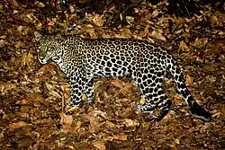 In the Indian subcontinent, the leopard is still relatively abundant, with greater numbers than those of other Panthera species.[2] Some leopard populations in India live quite close to human settlements and even in semi-developed areas. Although adaptable to human disturbances, leopards require healthy prey populations and appropriate vegetative cover for hunting for prolonged survival and thus rarely linger in heavily developed areas. Due to the leopard's stealth, people often remain unaware that it lives in nearby areas.[90] As of 2020, the leopard population within forested habitats in India's tiger range landscapes was estimated at 12,172 to 13,535 individuals. Surveyed landscapes included elevations below 2,600 m (8,500 ft) in the Shivalik Hills and Gangetic plains, Central India and Eastern Ghats, Western Ghats, the Brahmaputra River basin and hills in Northeast India.[91] In Nepal's Kanchenjunga Conservation Area, a melanistic leopard was photographed at an elevation of 4,300 m (14,100 ft) by a camera trap in May 2012.[92]