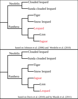 Results of phylogenetic studies based on nuclear DNA and mitochondrial DNA analysis showed that the last common ancestor of the Panthera and Neofelis genera is thought to have lived about 6.37 million years ago. Neofelis diverged about 8.66 million years ago from the Panthera lineage. The tiger diverged about 6.55 million years ago, followed by the snow leopard about 4.63 million years ago and the leopard about 4.35 million years ago. The leopard is a sister taxon to a clade within Panthera, consisting of the lion and the jaguar.[36][37]