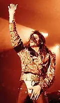 Jackson's fifth solo album and first album as an adult, Off the Wall (1979), established him as a solo performer and helped him move from the bubblegum pop of his youth to more complex sounds.[39] It produced four top 10 entries in the US: "Off the Wall", "She's Out of My Life", and the chart-topping singles "Don't Stop 'Til You Get Enough" and "Rock with You".[56] The album reached number three on the US Billboard 200 and sold over 20 million copies worldwide.[57] In 1980, Jackson won three American Music Awards for his solo work: Favorite Soul/R&B Album, Favorite Soul/R&B Male Artist, and Favorite Soul/R&B Single for "Don't Stop 'Til You Get Enough".[58][59] He also won a Grammy Award for Best Male R&B Vocal Performance for 1979 with "Don't Stop 'Til You Get Enough".[60] In 1981, Jackson was the American Music Awards winner for Favorite Soul/R&B Album and Favorite Soul/R&B Male Artist.[61]