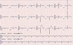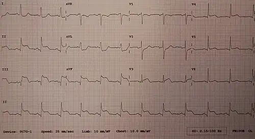 ECG readouts produce a waveform with different labeled features.[87] In addition to a rise in biomarkers, a rise in the ST segment, changes in the shape or flipping of T waves, new Q waves, or a new left bundle branch block can be used to diagnose an AMI.[24] In addition, ST elevation can be used to diagnose an ST segment myocardial infarction (STEMI). A rise must be new in V2 and V3 ≥2 mm (0,2 mV) for males or ≥1.5 mm (0.15 mV) for females or ≥1 mm (0.1 mV) in two other adjacent chest or limb leads.[19][24] ST elevation is associated with infarction, and may be preceded by changes indicating ischemia, such as ST depression or inversion of the T waves.[87] Abnormalities can help differentiate the location of an infarct, based on the leads that are affected by changes.[16] Early STEMIs may be preceded by peaked T waves.[19] Other ECG abnormalities relating to complications of acute myocardial infarctions may also be evident, such as atrial or ventricular fibrillation.[88]