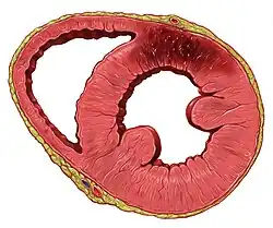 Cells in the area with the worst blood supply, just below the inner surface of the heart (endocardium), are most susceptible to damage.[77][78] Ischemia first affects this region, the subendocardial region, and tissue begins to die within 15–30 minutes of loss of blood supply.[79] The dead tissue is surrounded by a zone of potentially reversible ischemia that progresses to become a full-thickness transmural infarct.[76][79] The initial "wave" of infarction can take place over 3–4 hours.[73][76] These changes are seen on gross pathology and cannot be predicted by the presence or absence of Q waves on an ECG.[78] The position, size and extent of an infarct depends on the affected artery, totality of the blockage, duration of the blockage, the presence of collateral blood vessels, oxygen demand, and success of interventional procedures.[28][72]