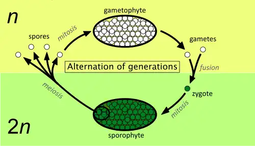 When reproducing sexually, plants have complex lifecycles involving alternation of generations. One generation, the sporophyte, which is diploid (with 2 sets of chromosomes), gives rise to the next generation, the gametophyte, which is haploid (with one set of chromosomes). Some plants also reproduce asexually via spores. In some non-flowering plants such as mosses, the sexual gametophyte forms most of the visible plant.[67] In seed plants (gymnosperms and flowering plants), the sporophyte forms most of the visible plant, and the gametophyte is very small. Flowering plants reproduce sexually using flowers, which contain male and female parts: these may be within the same (hermaphrodite) flower, on different flowers on the same plant, or on different plants. The stamens create pollen, which produces male gametes that enter the ovule to fertilize the egg cell of the female gametophyte. Fertilization takes place within the carpels or ovaries, which develop into fruits that contain seeds. Fruits may be dispersed whole, or they may split open and the seeds dispersed individually.[68]