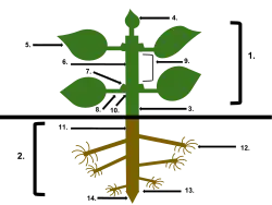 Growth is determined by the interaction of a plant's genome with its physical and biotic environment.[61] Factors of the physical or abiotic environment include temperature, water, light, carbon dioxide, and nutrients in the soil.[62] Biotic factors that affect plant growth include crowding, grazing, beneficial symbiotic bacteria and fungi, and attacks by insects or plant diseases.[63]
