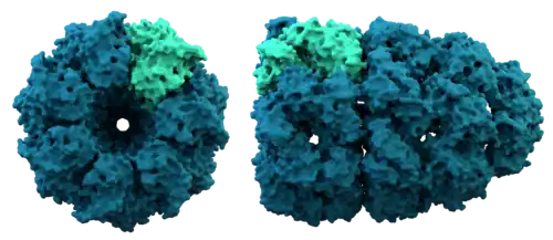 A typical bacterial cell, e.g. E. coli and Staphylococcus aureus, is estimated to contain about 2 million proteins. Smaller bacteria, such as Mycoplasma or spirochetes contain fewer molecules, on the order of 50,000 to 1 million. By contrast, eukaryotic cells are larger and thus contain much more protein. For instance, yeast cells have been estimated to contain about 50 million proteins and human cells on the order of 1 to 3 billion.[43] The concentration of individual protein copies ranges from a few molecules per cell up to 20 million.[44] Not all genes coding proteins are expressed in most cells and their number depends on, for example, cell type and external stimuli. For instance, of the 20,000 or so proteins encoded by the human genome, only 6,000 are detected in lymphoblastoid cells.[45] The most abundant protein in nature is thought to be RuBisCO, an enzyme that catalyzes the incorporation of carbon dioxide into organic matter in photosynthesis. Plants can consist of as much as 1% by weight of this enzyme.[46]
