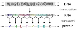 Proteins are assembled from amino acids using information encoded in genes. Each protein has its own unique amino acid sequence that is specified by the nucleotide sequence of the gene encoding this protein. The genetic code is a set of three-nucleotide sets called codons and each three-nucleotide combination designates an amino acid, for example AUG (adenine–uracil–guanine) is the code for methionine. Because DNA contains four nucleotides, the total number of possible codons is 64; hence, there is some redundancy in the genetic code, with some amino acids specified by more than one codon.[42]: 1002–42 Genes encoded in DNA are first transcribed into pre-messenger RNA (mRNA) by proteins such as RNA polymerase. Most organisms then process the pre-mRNA (a primary transcript) using various forms of post-transcriptional modification to form the mature mRNA, which is then used as a template for protein synthesis by the ribosome. In prokaryotes the mRNA may either be used as soon as it is produced, or be bound by a ribosome after having moved away from the nucleoid. In contrast, eukaryotes make mRNA in the cell nucleus and then translocate it across the nuclear membrane into the cytoplasm, where protein synthesis then takes place. The rate of protein synthesis is higher in prokaryotes than eukaryotes and can reach up to 20 amino acids per second.[47]