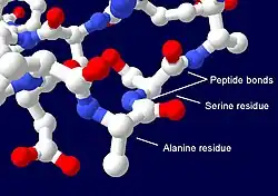 The amino acids in a polypeptide chain are linked by peptide bonds between amino and carboxyl group. An individual amino acid in a chain is called a residue, and the linked series of carbon, nitrogen, and oxygen atoms are known as the main chain or protein backbone.[36]: 19 The peptide bond has two resonance forms that confer some double-bond character to the backbone. The alpha carbons are roughly coplanar with the nitrogen and the carbonyl (C=O) group. The other two dihedral angles in the peptide bond determine the local shape assumed by the protein backbone. One consequence of the N-C(O) double bond character is that proteins are somewhat rigid.[36]: 31 A polypeptide chain ends with a free amino group, known as the N-terminus or amino terminus, and a free carboxyl group, known as the C-terminus or carboxy terminus.[37] By convention, peptide sequences are written N-terminus to C-terminus, correlating with the order in which proteins are synthesized by ribosomes.[37][38]