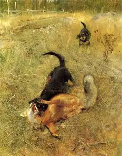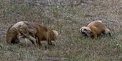 - ^ Böcker, F.; Weber, H.; Arnold, J.; Collet, S.; Hatlauf, J. (2024). "Interspecific social interaction between golden jackal (Canis aureus) and red fox (Vulpes vulpes)". Mammal Research. 69 (2): 319–324. doi:10.1007/s13364-024-00737-2.