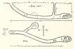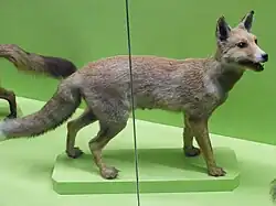 The species is Eurasian in origin, and may have evolved from either Vulpes alopecoides or the related Chinese V. chikushanensis, both of which lived during the Middle Villafranchian of the Pleistocene Epoch.[19] The earliest fossil specimens of V. vulpes were uncovered in Baranya County, Hungary, dating from 3.4 to 1.8 million years ago.[20] The ancestral red fox was likely more diminutive compared to today's extant foxes, as the earliest red fox fossils have shown a smaller build than living specimens.[19]: 115–116 The earliest fossil remains of the modern species date back to the mid-Pleistocene,[21] found in association with middens and refuse left by early human settlements. This has led to the theory that the red fox was hunted by primitive humans (as both a source of food and pelts); the possibility also exists of red foxes scavenging from middens or butchered animal carcasses.[22]
