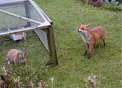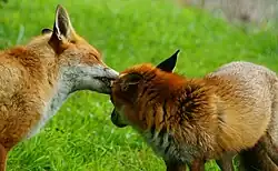 Red foxes are usually found in pairs or small groups consisting of families, such as a mated pair and their young, or a male with several females having kinship ties. The young of the mated pair remain with their parents to assist in caring for new kits.[9] The species primarily feeds on small rodents, though it may also target rabbits, squirrels, game birds, reptiles, invertebrates[7] and young ungulates.[7] Fruit and vegetable matter is also eaten sometimes.[10] Although the red fox tends to kill smaller predators, including other fox species, it is vulnerable to attack from larger predators, such as wolves, coyotes, golden jackals, large predatory birds such as golden eagles and Eurasian eagle owls,[11] and medium- and large-sized felids.[12]