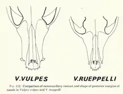 The red fox is considered to be a more specialised form of Vulpes than the Afghan, corsac and Bengal fox species, in regards to their overall size and adaptation to carnivory; the skull displays far fewer neotenous traits than in other foxes, and its facial area is more developed.[7] It is, however, not as adapted for a purely carnivorous diet as the Tibetan fox.[7]